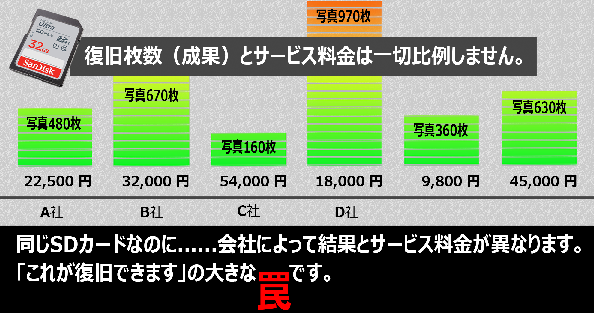 この事実が示すように、データ復旧サービスにおいて、復旧枚数(成果)とサービス料金は一切比例しません。